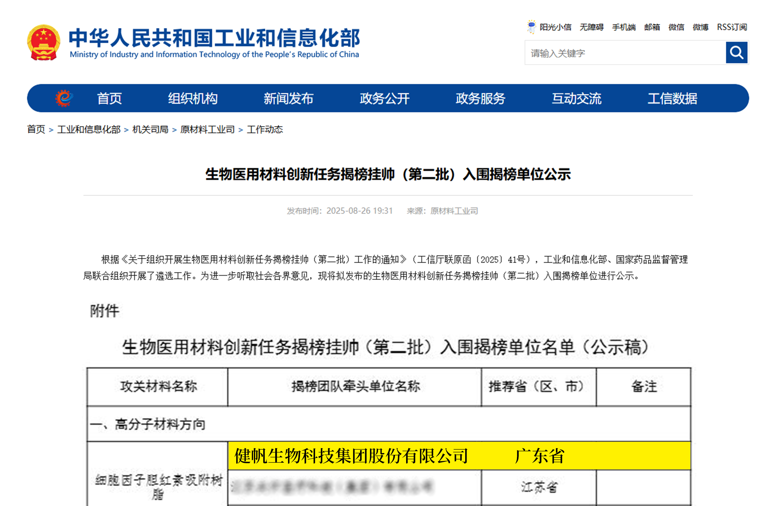 2025年8月26日,工業(yè)和信息化部公示了第二批生物醫(yī)用材料創(chuàng)新任務“揭榜掛帥”入圍名單。健帆生物憑借自身卓越的研發(fā)實力和創(chuàng)新能力成功入選,成為廣東省唯一入圍細胞因子膽紅素吸附樹脂高分子材料研制項目的單位。